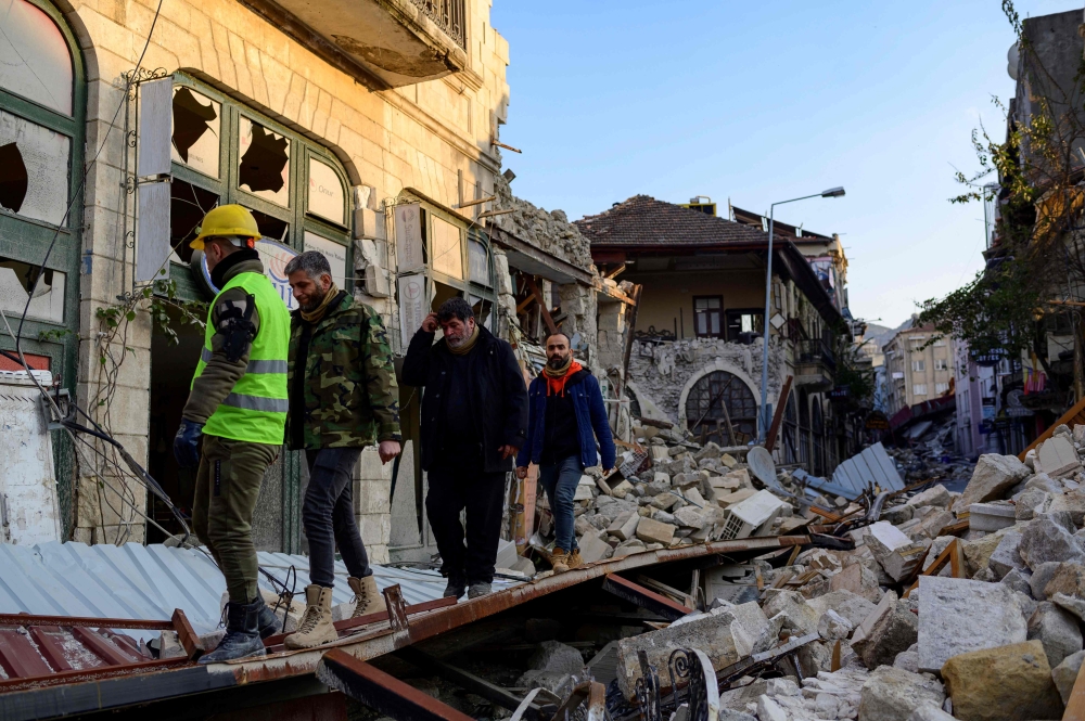 People walk among the rubble of the historic southern city of Antakya on February 12, 2023, after a 7.8 magnitude earthquake struck the border region of Turkey and Syria earlier in the week. (Photo by Yasin AKGUL / AFP)