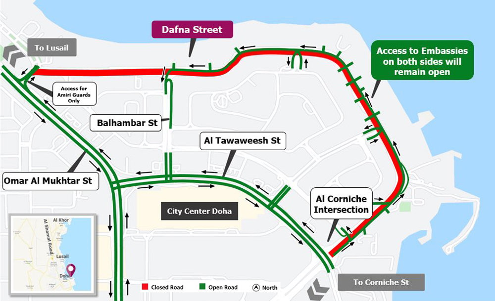 Dafna Street will also be closed in one direction from its intersection with Balhambar Street to Al Dafna Intersection. Access to embassies on both sides will stay open, Ashghal said in a tweet.