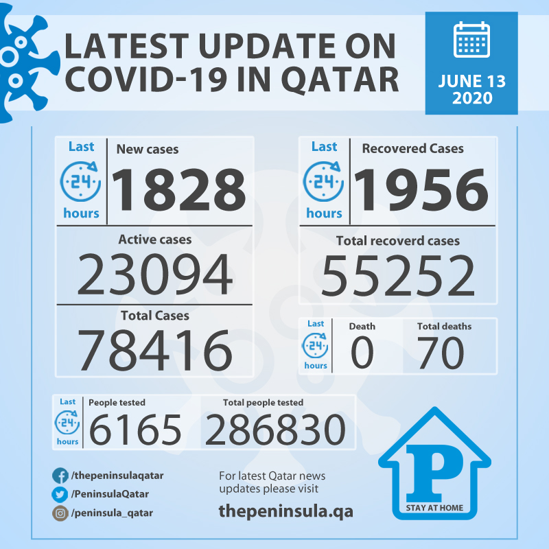 Ministry of Public Health today announced 1828 confirmed new cases of coronavirus (Covid-19), with 1956 people recovered from the disease in the last 24 hours, bringing the total number of people recovered in the State of Qatar to 55252 cases.