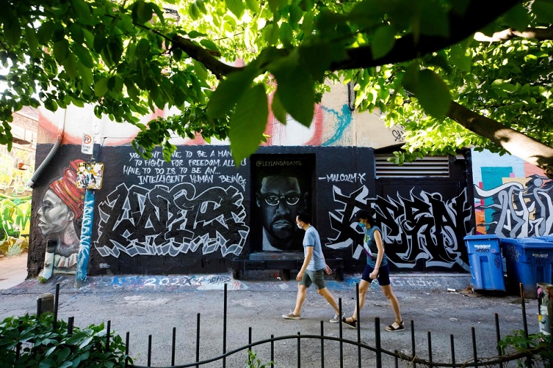 People walk by a mural of Malcom X in Graffiti Alley in Toronto, Ontario, Canada, June 11, 2020. AFP / Cole Burston