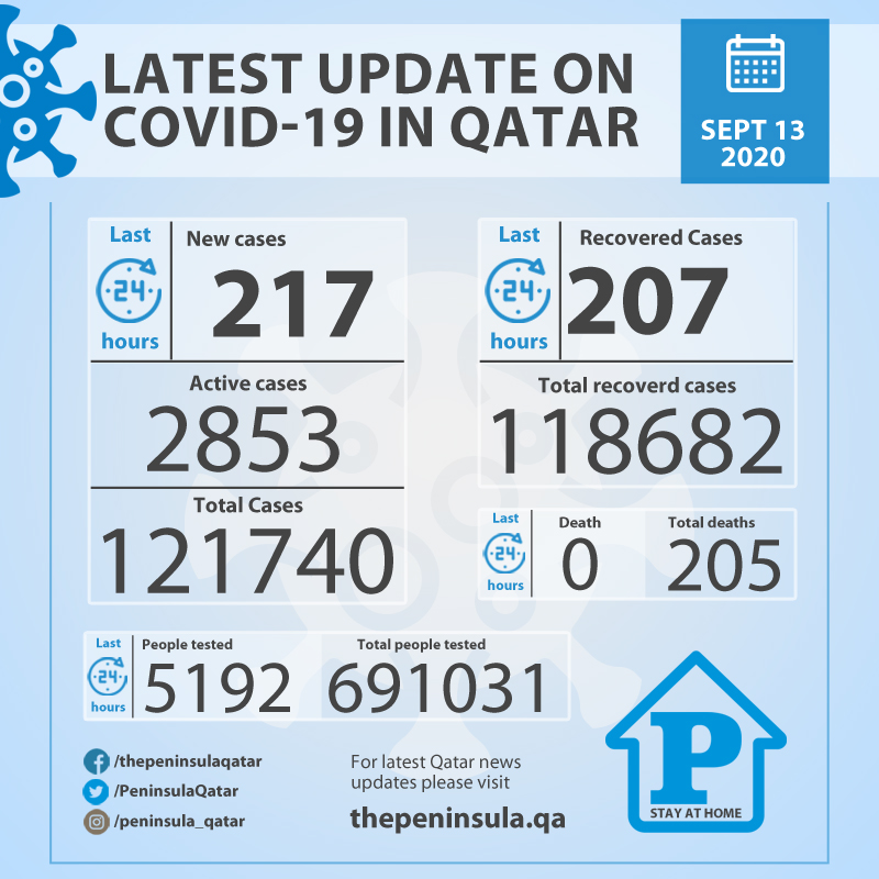Doha: Ministry of Public Health (MoPH) today recorded 217 new cases of coronavirus (COVID-19) and 207 people recovered from the virus in the last 24 hours, bringing the total number of people recovered in Qatar to 118,682
