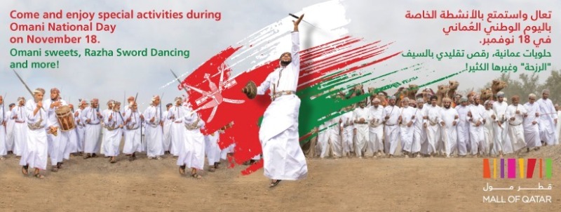 Omani troupe will entertain visitors at Mall of Qatar with their traditional instruments on Monday, November 18 as they will be celebrating Oman’s National day. The troupe consists of 15 dancers, singers and musicians who will take over the Oasis stage for 3 performances at 6.30pm, 7.30pm and 8.30pm. The mall’s visitors will also be offered Omani sweet (Halwa) throughout the day along with branded balloons.