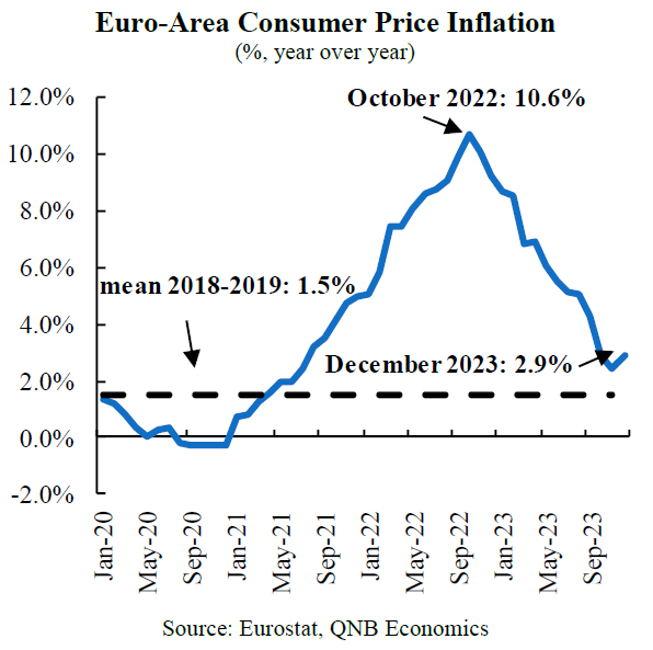 With inflation rocketing high above the target of monetary policy, the response from the European Central Bank (ECB) followed. The ECB embarked on a record tightening cycle of 10 consecutive rate hikes, increasing its main refinancing rate by 450 basis points to 4.5% in September 2023 to bring inflation down. After reaching its peak in October 2022, inflation began a downward trend with a significant contribution from declining energy prices and the normalization of supply-chain conditions. Inflation came at 2.9% in the latest release, down by close to 8 percentage points (p.p.) in a year, and now standing less than 1 percentage point away from the 2% target of the ECB.
