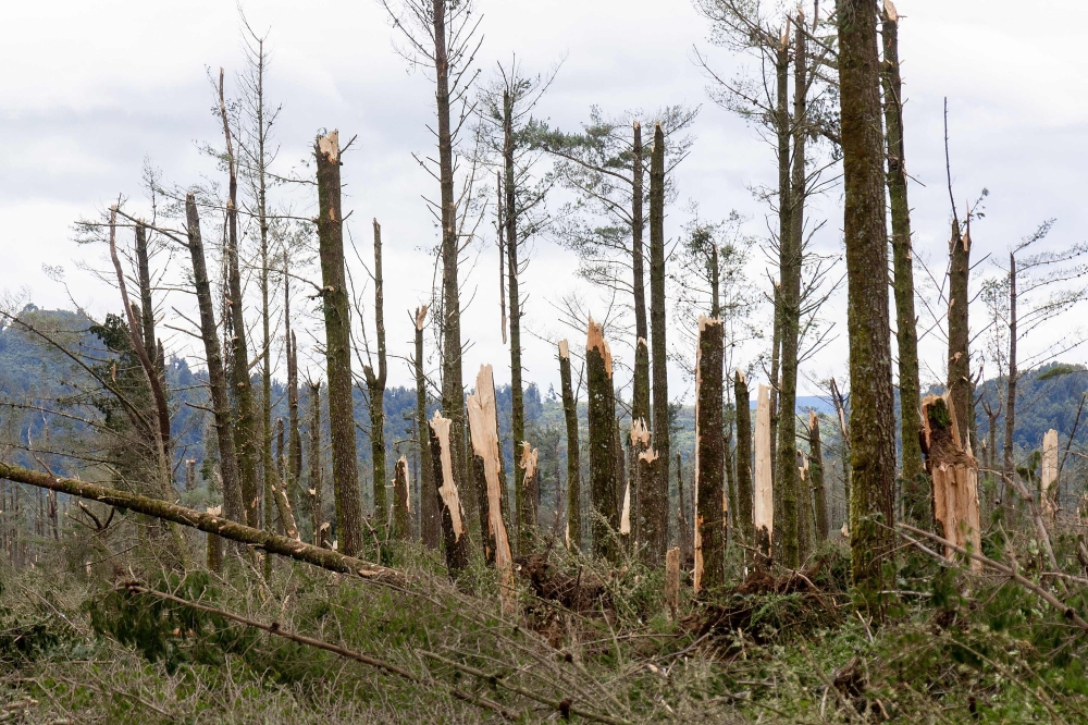 This picture shows trees damaged by gale force winds during tropical storm Gabrielle at a commercial pine forest in Tongariro on February 14, 2023. Photo by Marty MELVILLE / AFP