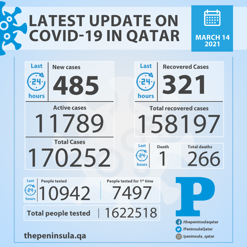 Ministry of Public Health (MoPH) today reported 485 new cases of coronavirus (Covid-19) and 321 people recovered from the virus in the last 24 hours, bringing the total number of people recovered in Qatar to 158,197.