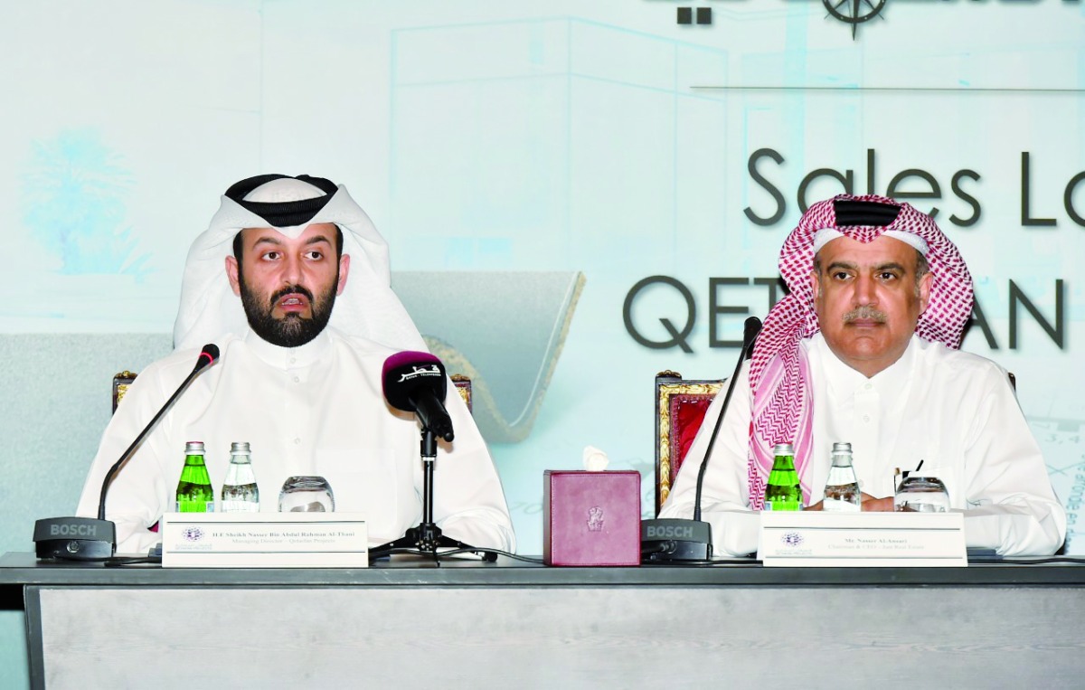Managing Director of Qetaifan Projects Sheikh Nasser bin Abdulrahman Al Thani (left) with Chairman and CEO of Just Real Estate Nasser Hassan Al Ansari, during the press conference at the Ritz-Carlton Hotel, Doha, yesterday. Pic: Abdul Basit
