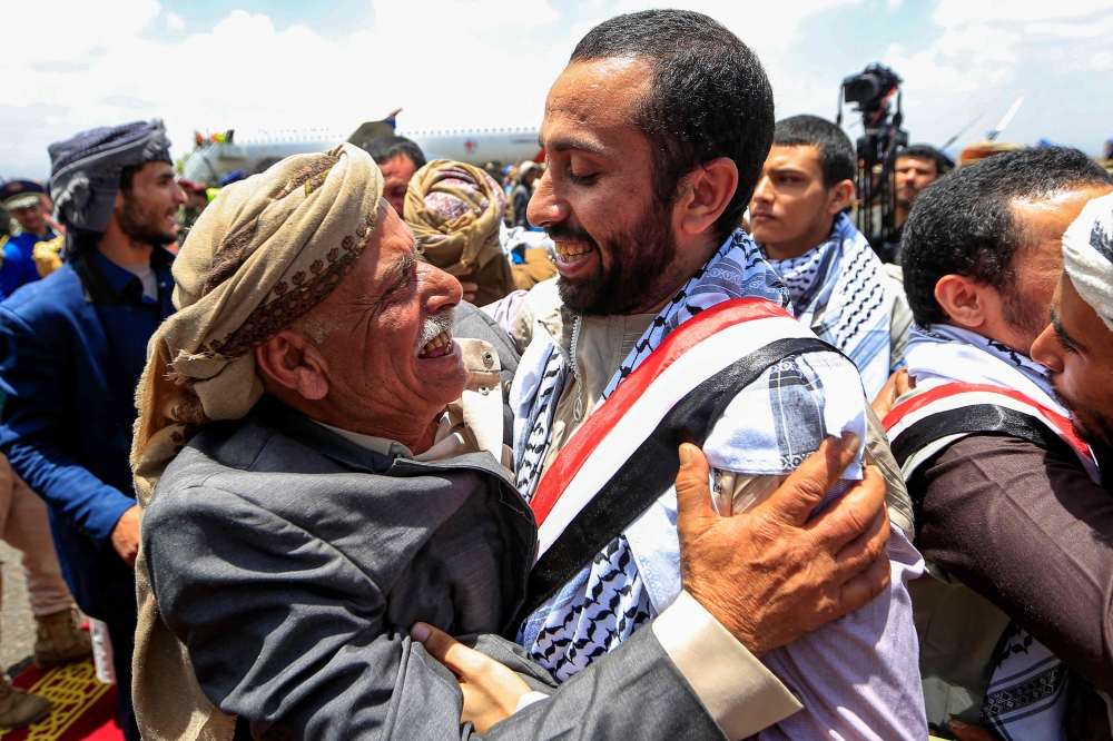 In Sanaa, the Houthi-held capital of Yemen, dozens of former prisoners descended from a plane to a marching band and traditional Yemeni dancers, wearing ribbons with the colors of the Yemeni flag. Family members and a reception line of Houthi political leaders greeted the released with hugs and kisses.