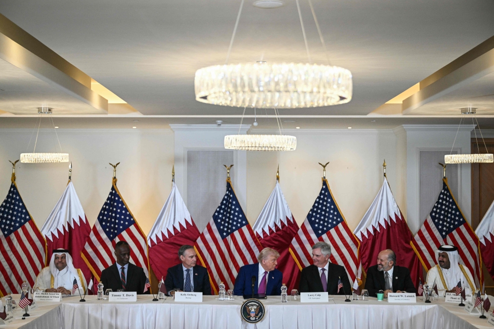 US President Donald Trump (C) attends a breakfast with business leaders in Doha on May 15, 2025. (Photo by Brendan Smialowski / AFP)