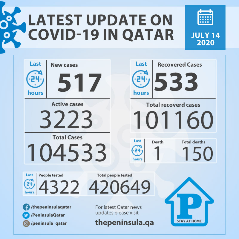 Ministry of Public Health today recorded 517 new cases of coronavirus (COVID-19) and 533 people recovered from the virus in the last 24 hours, bringing the total number of people recovered in Qatar to 101160. The Ministry also announced one death due to Covid-19.