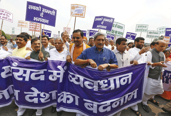 Among those who marched from Vijay Chowk to Mahatma Gandhi’s statue in parliament complex were BJP stalwart L.K. Advani, Finance Minister Arun Jaitley and Home Minister Rajnath Singh.