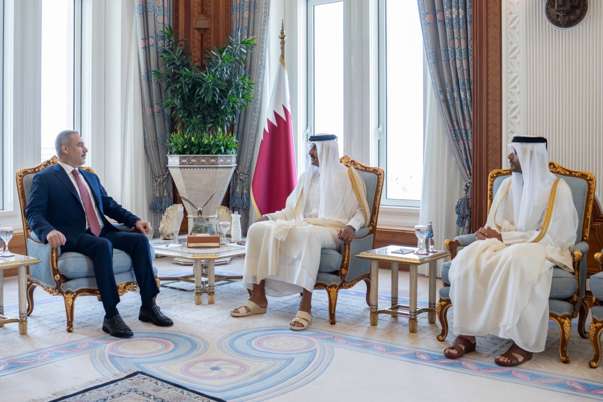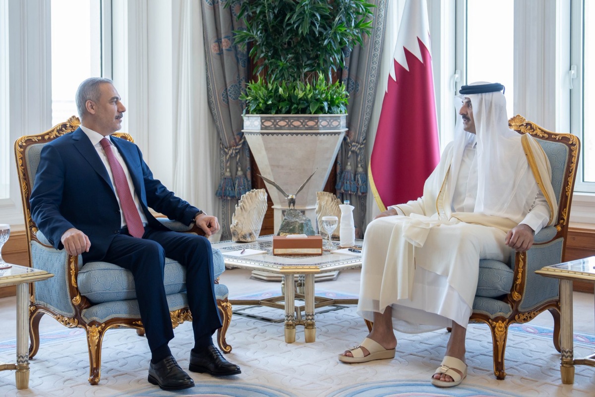 Doha, Qatar: The Amir His Highness Sheikh Tamim bin Hamad Al-Thani received at his office at the Amiri Diwan Minister of Foreign Affairs of the sisterly Republic of Turkiye HE Hakan Fidan, on Thursday, August 14, 2025, on the occasion of his visit to the country.