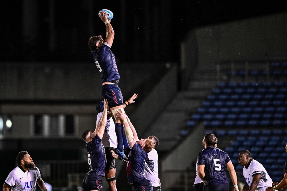 Greg Peterson of the US jumps to catch the ball during the Pacific Nations Cup semi-final rugby union match between Fiji and the US on September 14, 2024. (Photo by Yuichi Yamazaki / AFP)