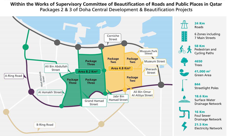 “Packages 2 & 3 projects of Doha Central Development and Beautification Projects include development of 6 main areas between Corniche Street & A-Ring Road, to cover 7 main streets, develop infrastructure, build plazas, pedestrian & cycle Paths, & other works,” Ashghal said in another post.