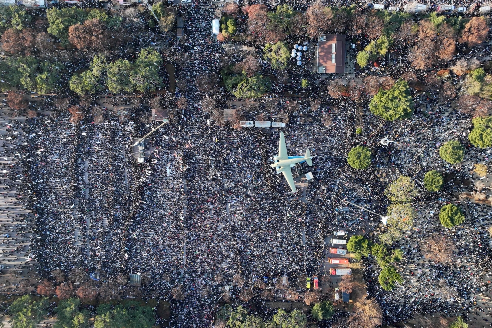 Aerial photograph shows protesters calling for the ouster of South Korea President Yoon Suk Yeol gathering to await the outcome. (Photo by JUNG YEON-JE / AFP)