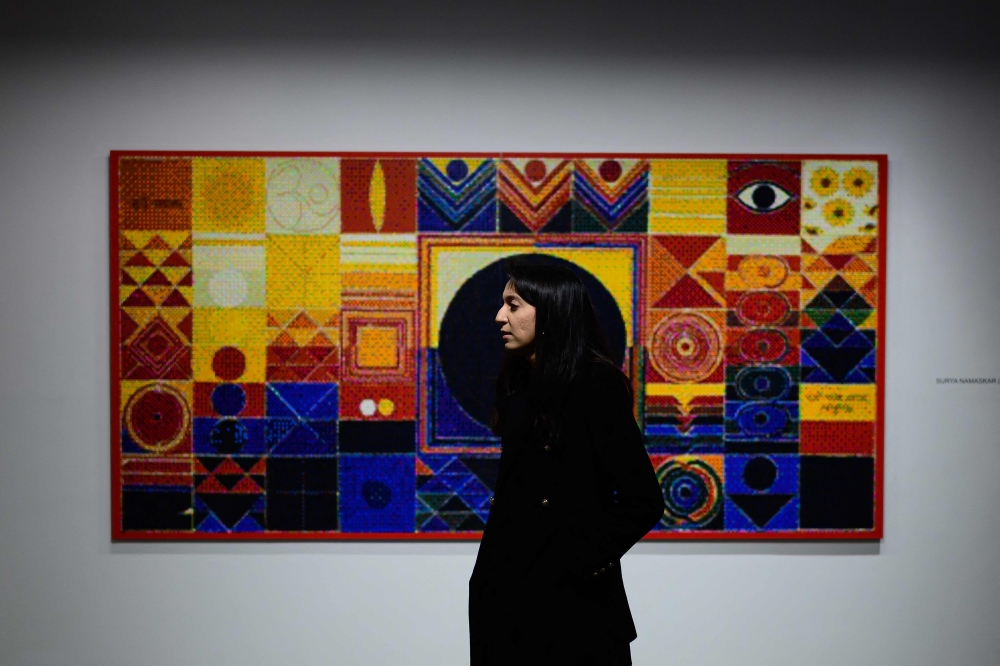 A member of the gallery walks past an artwork titled "Surya Namaskar" by Chinese artist Ai Weiwei displayed during the preview of his first solo exhibition in India, at the Nature Morte gallery in New Delhi on January 15, 2026. (Photo by Manan VATSYAYANA / AFP)