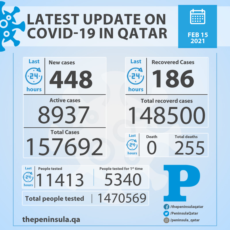 Doha: Ministry of Public Health (MoPH) today reported 448 new cases of coronavirus (Covid-19) and 186 people recovered from the virus in the last 24 hours, bringing the total number of people recovered in Qatar to 148,500.