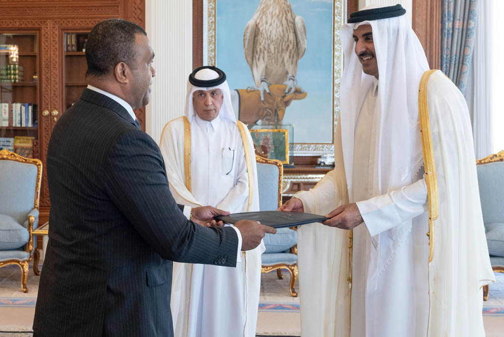 His Highness the Amir received the credentials of Ambassador of the Republic of Chad HE Dausa Idriss Deby Itno, Ambassador to the Republic of Niger HE Abdulkarim Soumana, Ambassador of the People’s Democratic Republic of Algeria HE Salah Attia, Ambassador of the Republic of Ireland H E Alison Milton, Ambassador of the Republic of Slovenia HE Natalia Al Mansour, and Ambassador of the Republic of Fiji HE Naipote Tako Katonitabua.