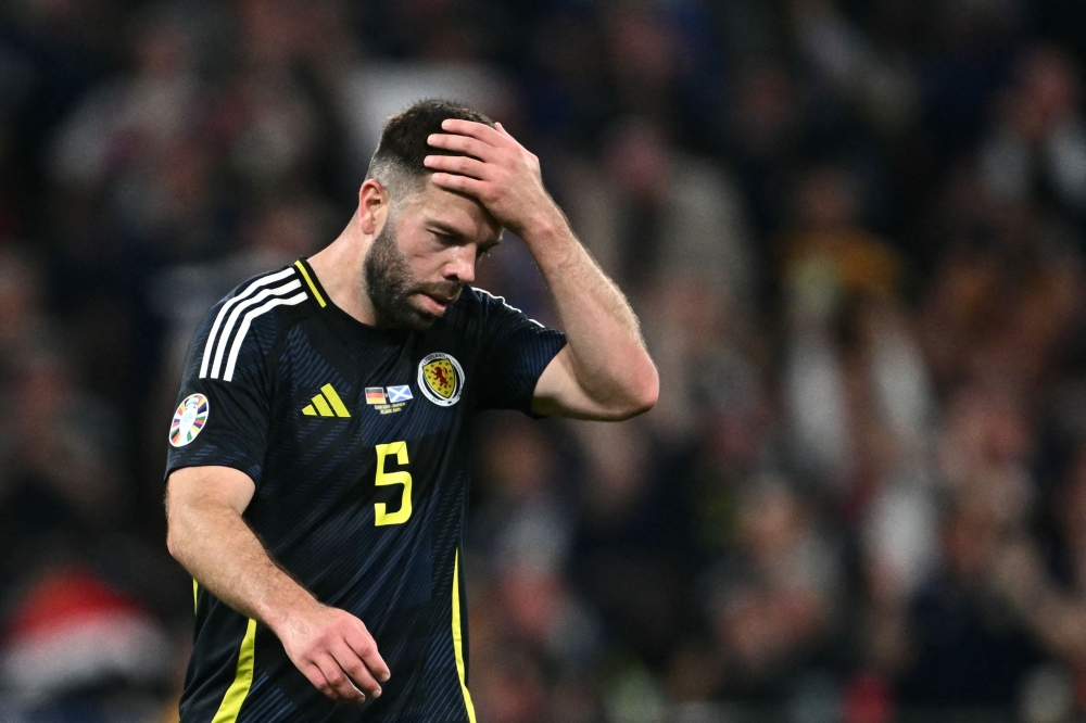 Scotland's defender #05 Grant Hanley reacts during the UEFA Euro 2024 Group A football match between Germany and Scotland at the Munich Football Arena in Munich on June 14, 2024. Photo by Fabrice COFFRINI / AFP.