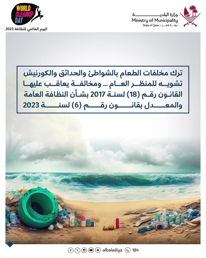 Doha, Qatar: In celebration of World Cleanup Day 2023, which falls on September 16, the Ministry of Municipality has again called on people in Qatar to refrain from littering and adhere to the law on public hygiene in the country.