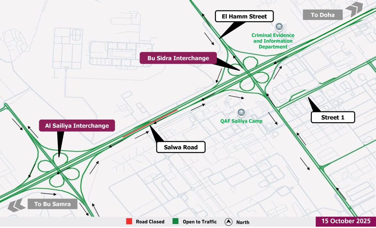 According to Ashghal’s announcement on social media, Salwa Road Exit 17, for traffic coming from Salwa Road towards Mebaireek and Al Sailiya, will be closed on Friday, October 17, 2025, from 2am to 10am, and on Saturday, October 18, 2025, from 2am to 8am. The closure is required to carry out maintenance work on overhead directional signs.