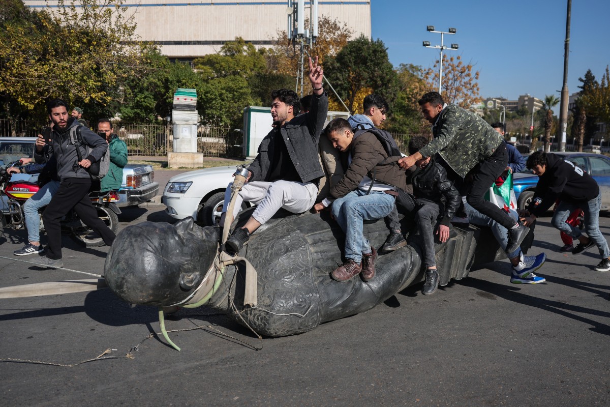A driver flashes the victory sign as students drag the statue of late president Hafez al-Assad during a rally near the campus of the Damascus University in the Syrian capital on December 15, 2024. Photo by Omar HAJ KADOUR / AFP.