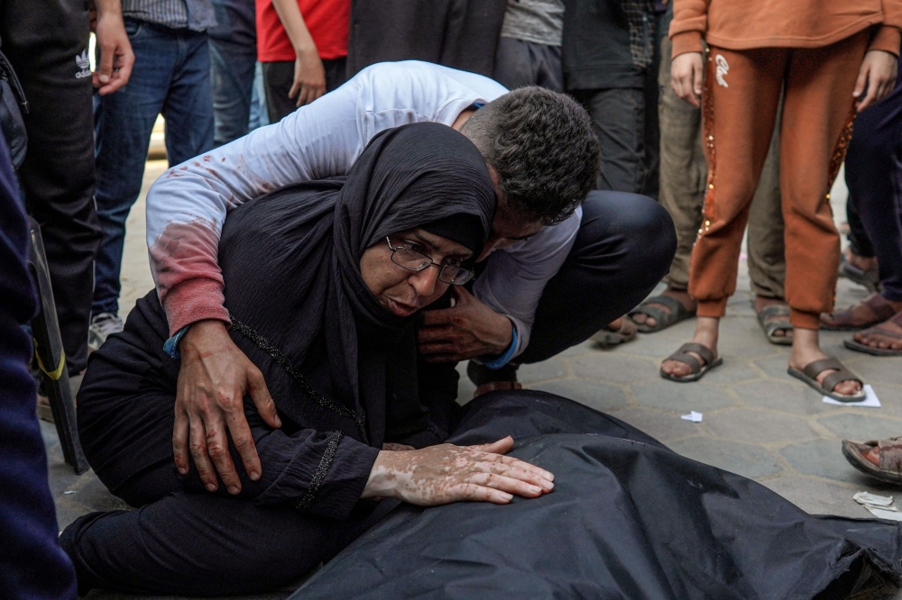 Palestinians mourn over the body of a victim of Israeli bombardment in Maghazi in the central Gaza Strip, on April 16, 2024. (Photo by AFP)