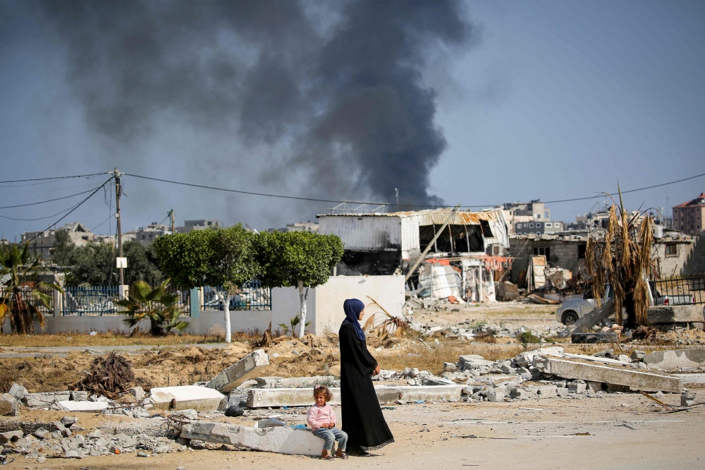 Smoke billows as a woman and child look on amid the rubble of buildings destroyed during Israeli bombardment in Khan Yunis, on the southern Gaza Strip on April 16, 2024. (Photo by AFP)
