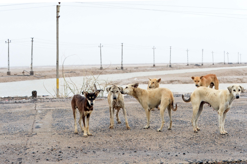 Stray dogs are seen on a deserted road near Jakhau port on June 16, 2023, after cyclone Biparjoy made landfall. (Photo by SAM PANTHAKY / AFP)