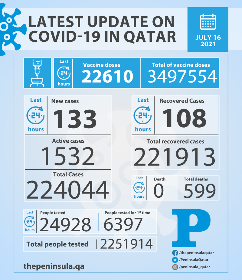 Doha: Ministry of Public Health (MoPH) today reported 133 new cases of coronavirus (Covid-19) and 108 people recovered from the virus in the last 24 hours, bringing the total number of people recovered in Qatar to 221,913.