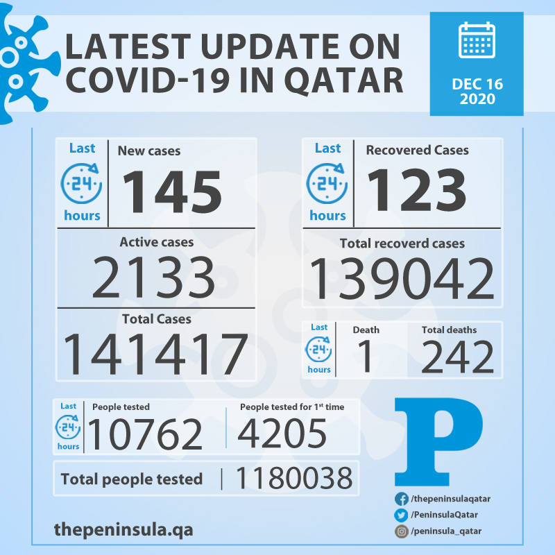 Doha: Ministry of Public Health (MoPH) today recorded 145 new cases of coronavirus (COVID-19) and 123 people recovered from the virus in the last 24 hours, bringing the total number of people recovered in Qatar to 139,042.