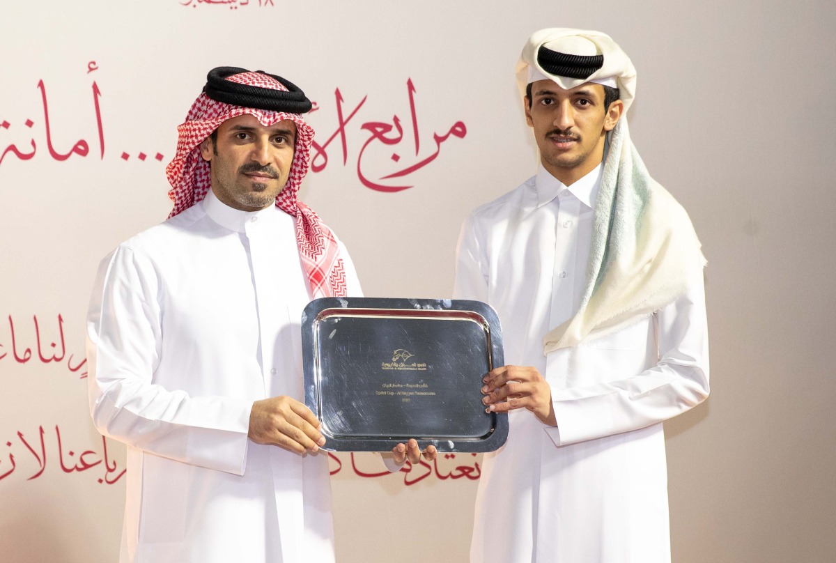 Qatar Racing and Equestrian Club's Acting CEO Bader Mohammed Al Darwish presents the winner's trophy to the connection of Lekhraib (QA) (AF AlBahar) after Sheikh Abdullah Bin Mishal Bin Hamad Al Thani’s 7-year-old landed the Sprint Cup at Al Rayyan Racecourse, yesterday.