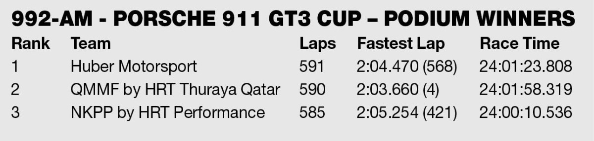 Their main rivals in the 992 AM category, Huber Motorsports completed 591 laps in 24:01:23.808, with a top speed of 155.89kmh late into the 24-hour race - in the 568th lap.