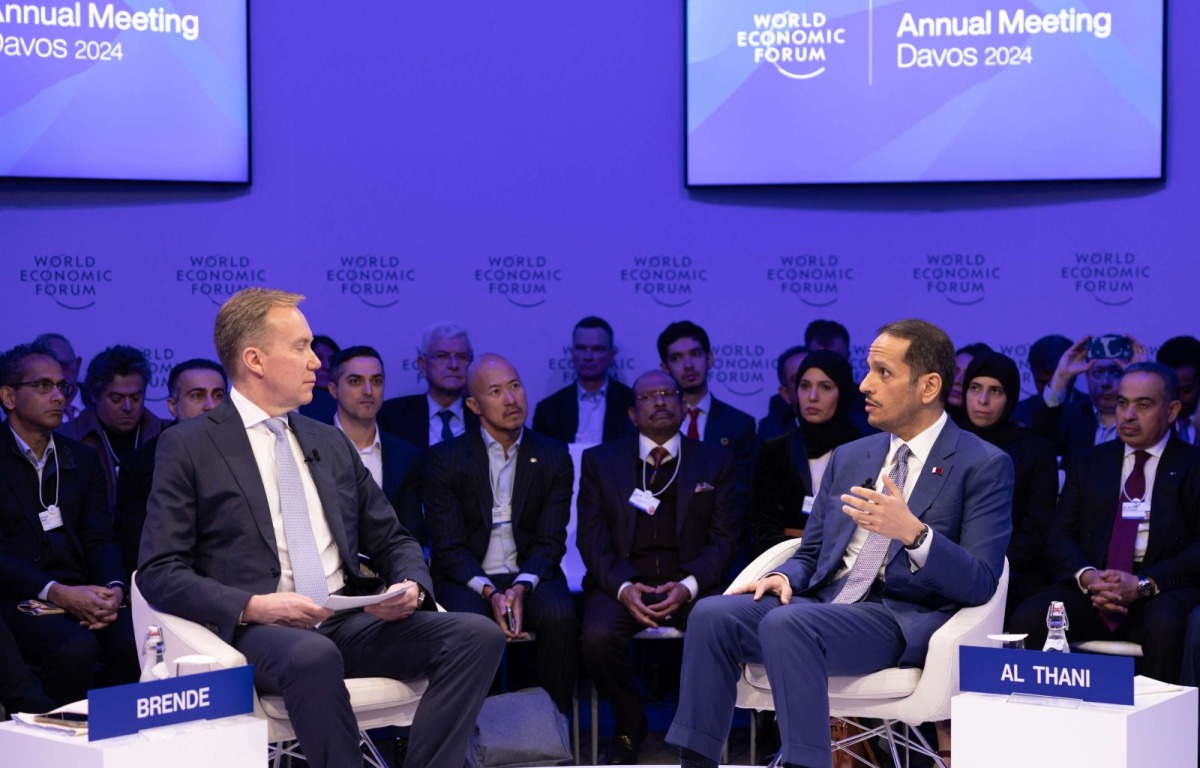 Prime Minister and Minister of Foreign Affairs H E Sheikh Mohammed bin Abdulrahman Al Thani speaking with World Economic Forum President Børge Brende (not in picture) in Davos.