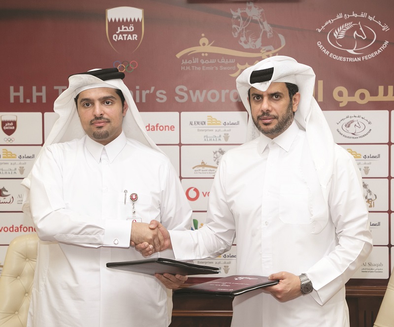Asian Equestrian Federation and QEF President Hamad Abdurahman Al Attiyah and Hamad bin Abdullah Al Thani, CEO of Vodafone Qatar, exchange documents after the sponsorship signing ceremony ahead of the H H The Amir Sword Festival 2020.