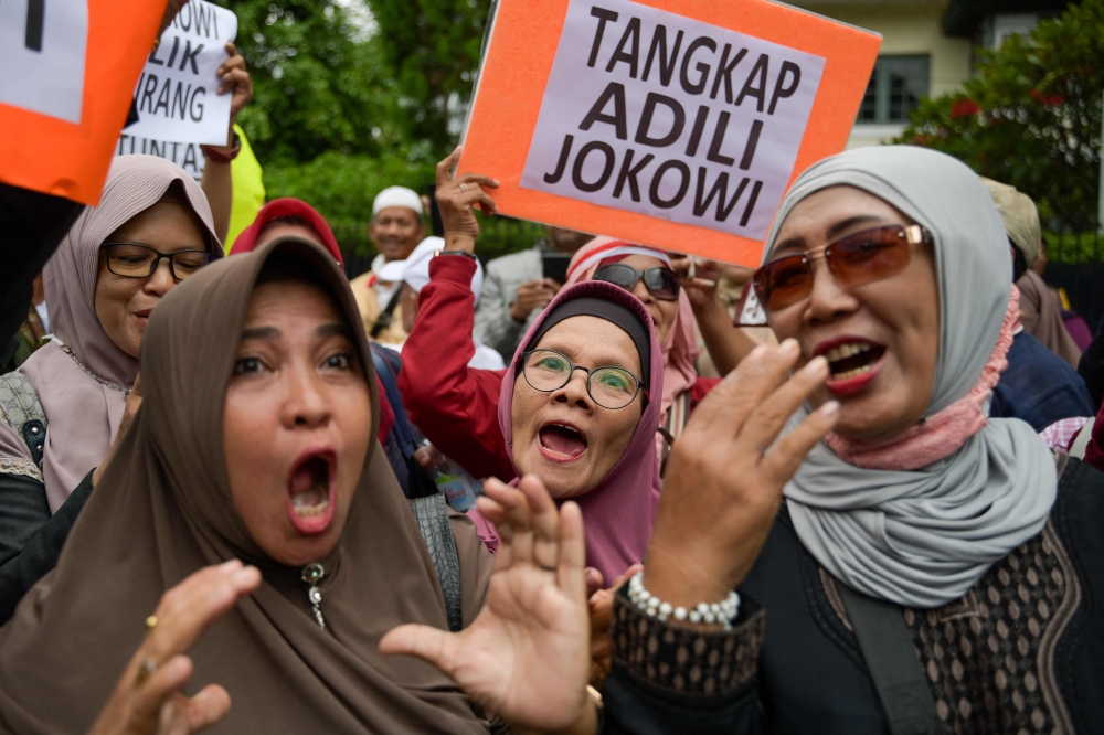 Dozens of demonstrators held banners and signs that slammed President Joko Widodo for supporting Subianto, who picked Widodo’s son as his running mate.