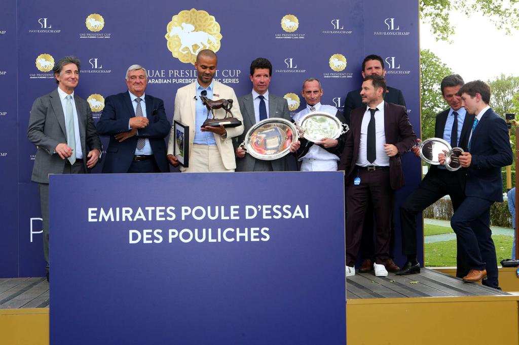 The connection of Mangoustine receive the trophies after the filly, co-owned by former NBA star Tony Parker, Qatar Racing Limited, Ecurie Des Monceaux and Alexandre Giannotti, won the Group 1 Emirates Poule D'essai Des Pouliches at ParisLongchamp on Sunday.