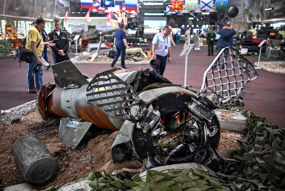 People inspect the wreckage of a Ukrainian operational-tactical missile Tochka-U at the exposition field in Kubinka Patriot Park outside Moscow on August 15, 2023 during the International Military Forum Army 2023. (Photo by Alexander Nemenov / AFP)