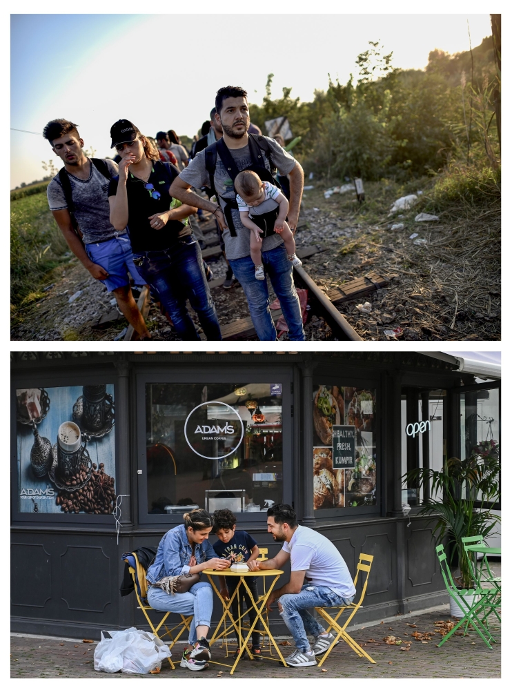 This combination of photographs created on December 15, 2020, shows (TOP): Iraqi refugees Ahmad (R) and Alia with their then four month old baby Adam as they walk on a railway line at the Serbian-Hungarian border at Horgos on September 1, 2015, and (BOTTOM): Ahmad (R) with his wife Alia (L) and their five year old son Adam sit at a coffee shop in the city of Arnhem, The Netherlands on September 23, 2020.