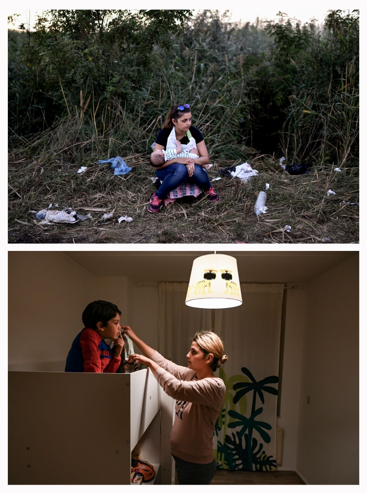 This combination of photographs created on December 15, 2020, shows (TOP): Iraqi refugee Alia and her then four month old baby Adam as they rest next to a railway line as they try to cross from Serbia to the Hungarian border at Horgos on September 1, 2015, and (BOTTOM): Alia puts her five years old son Adam to bed in their house at the town of Duiven, The Netherlands on September 24, 2020.