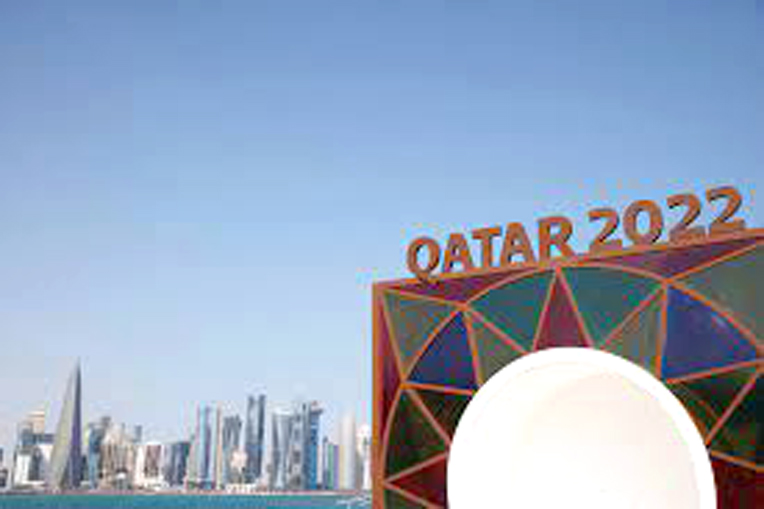 Qatar 2022 logo in front of the skyline of the West Bay in Doha.