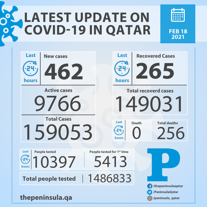 Doha: Ministry of Public Health (MoPH) today reported 462 new cases of coronavirus (Covid-19) and 265 people recovered from the virus in the last 24 hours, bringing the total number of people recovered in Qatar to 149,031.