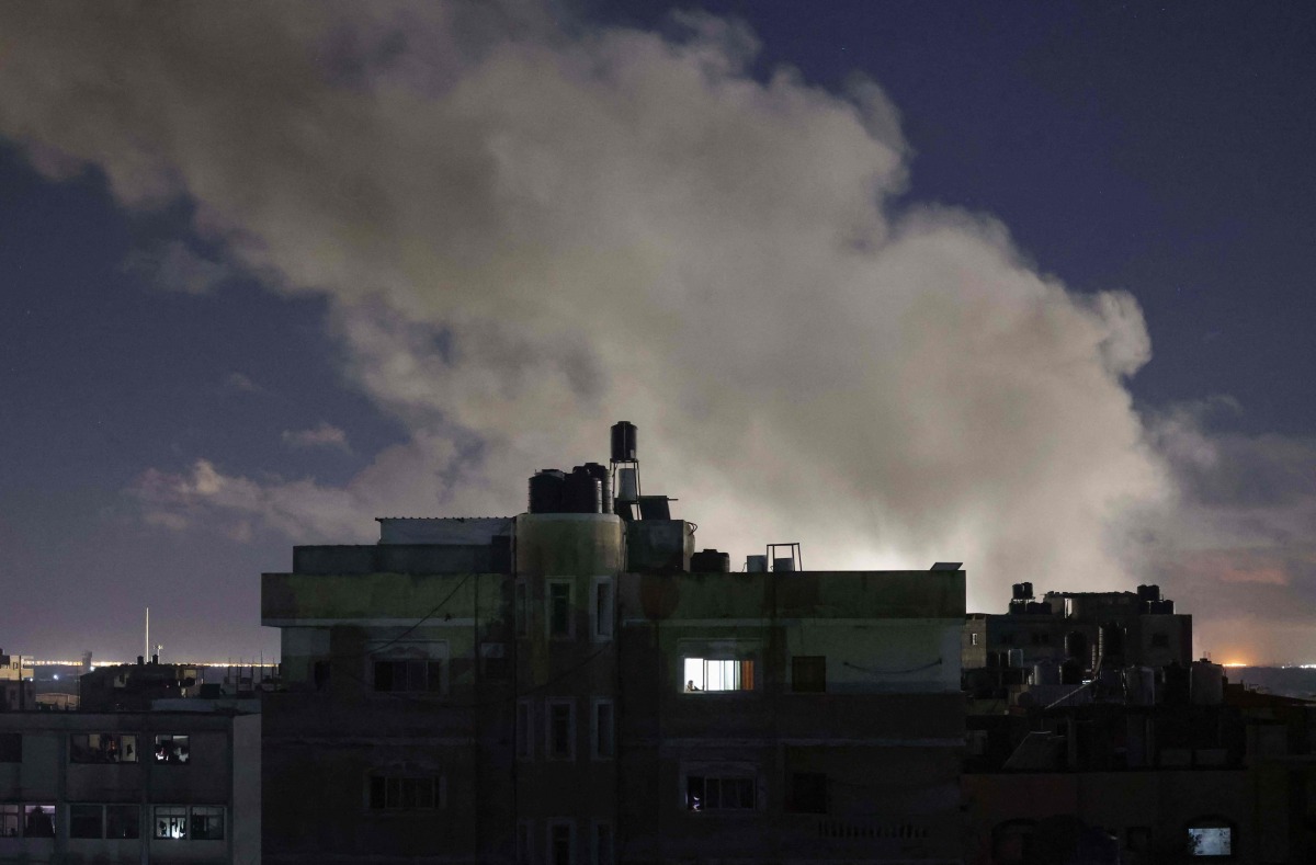 Smoke billows over buildings during Israeli bombardment south of Rafah in the southern Gaza Strip near the border with Egypt on February 17, 2024 (Photo by MOHAMMED ABED / AFP)
