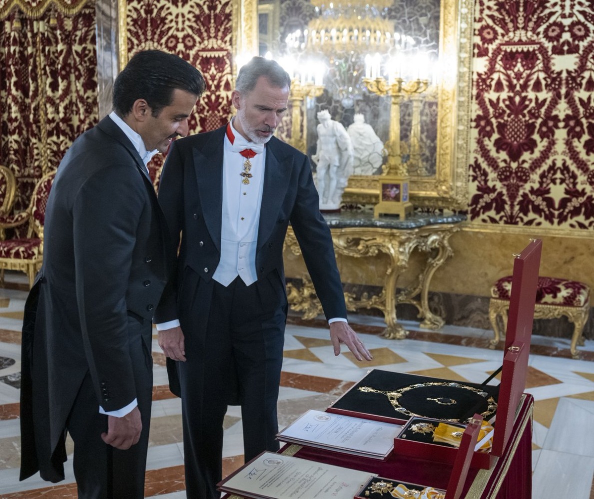 HH the Amir was presented with the Collar of the Order of Isabella the Catholic from HM King Felipe VI, which is the highest decoration granted to heads of state and high-ranking personalities, as an expression of the strength of relations between the two countries. On his part, HH the Amir presented HM King Felipe VI with the Sword of the Founder Sheikh Jassim bin Mohammed bin Thani, in an embodiment of the bonds of friendship between the two friendly countries and peoples.