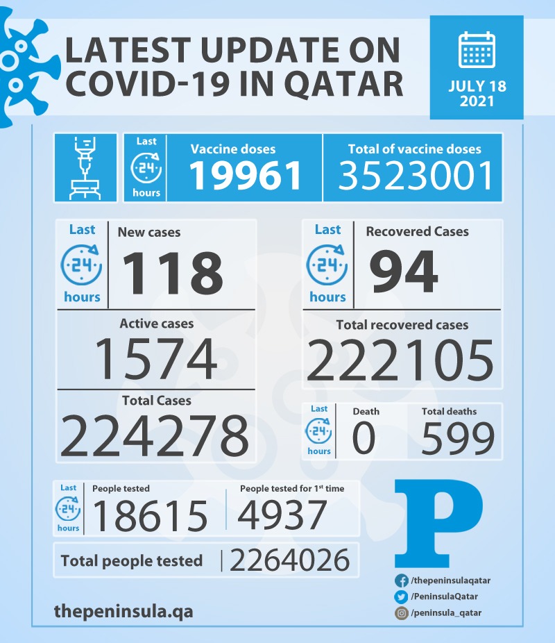 Doha: Ministry of Public Health (MoPH) today reported 118 new cases of coronavirus (Covid-19) and 94 people recovered from the virus in the last 24 hours, bringing the total number of people recovered in Qatar to 222,105.