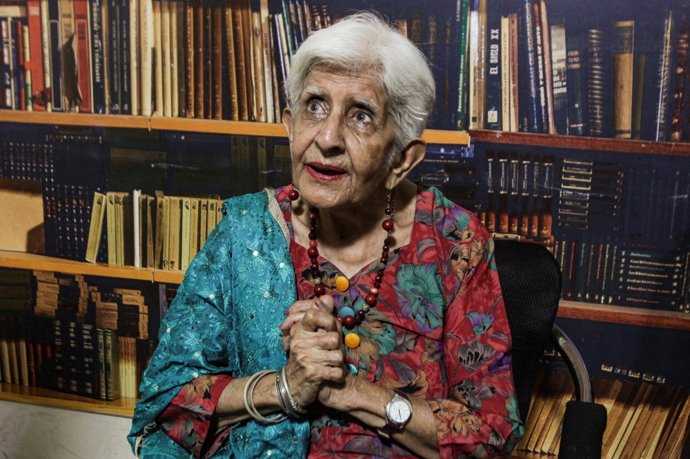 Reena Varma, 92-year-old Indian citizen born in Pakistan, who after 75 years came to visit her ancestral home and school, speaks during an interview with Reuters, in Lahore, Pakistan, on July 16, 2022. (REUTERS/Mohsin Raza)