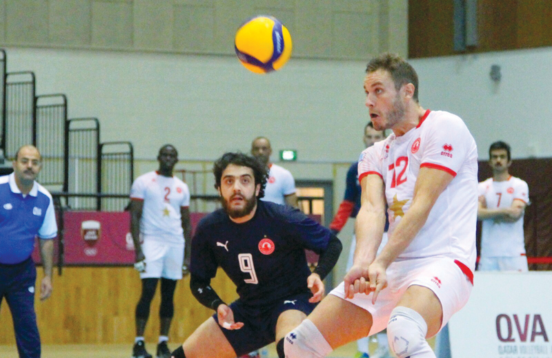 An Al Arabi player returns the ball to Police during yesterday's Senior Men's Volleyball League match played at the Qatar Volleyball Association Hall.