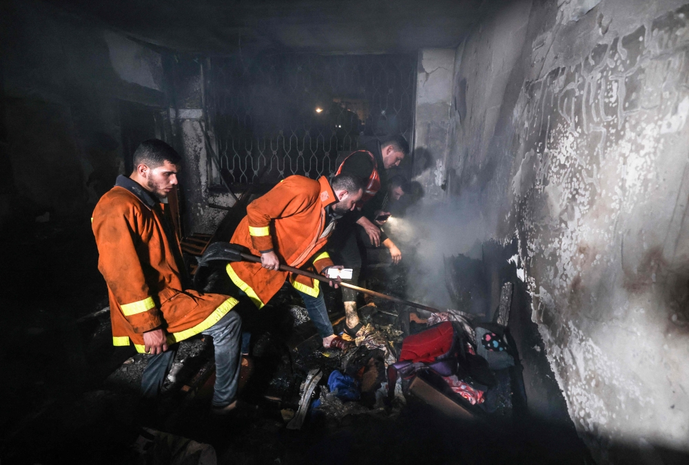 Palestinian firefighters extinguish a fire that broke out in one of the apartments in the Jabalia refugee camp in the northern Gaza strip, on November 17, 2022. (AFP/Mahmud Hams)