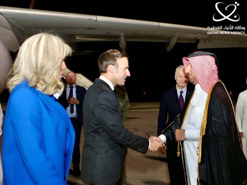 The French president and the accompanying delegation were welcomed upon arrival at Hamad International Airport by the Director of Department of Protocol at the Ministry of Foreign Affairs H E Ibrahim bin Yousif Fakhro, Qatar's Ambassador to France H E Sheikh Ali bin Jassim Al-Thani and the Ambassador of France to Qatar H E Jean-Baptiste Faivre.