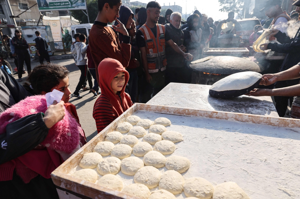 Palestinians prepare traditional unleavened bread in Rafah in the southern Gaza Strip on December 18, 2023. Photo by MOHAMMED ABED / AFP