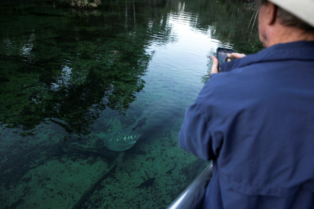 A man uses his phone to take a photo of a manatee from the access ramp to the spring at Blue Spring State Park, in Orange City, Florida, US, January 11, 2023. (REUTERS/Marco Bello)
